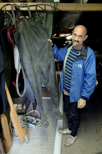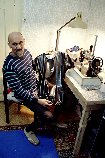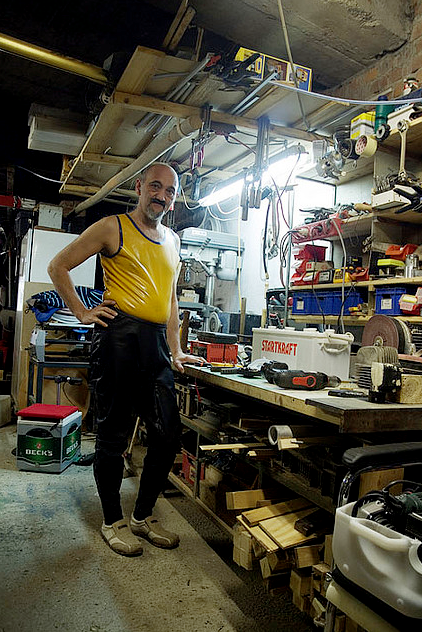 SEINER LIEBE ZU GUMMI VERLEIHT UDO AUSDRUCK INDEM ER IN SEINEM NÄHZIMMER SEINE EIGENE KOLLEKTION ANFERTIGT, MIT SEINEN „WANDERS“ BOOT FAHREN GEHT ODER IN SEINER WERKSTATT ALLERHAND KREATIVES BAUT – ZUM BEISPIEL EINE PENISPUMPE. GUMMI TRÄGT ER IMMER – AUCH AUF DER ARBEIT – ABER SO, DASS ES KEINER MERKT. NICHT WEIL ER SICH VERSTECKT, SONDERN WEIL ER ES GANZ FÜR SICH UND SEINE LEIDENSCHAFT MACHT.